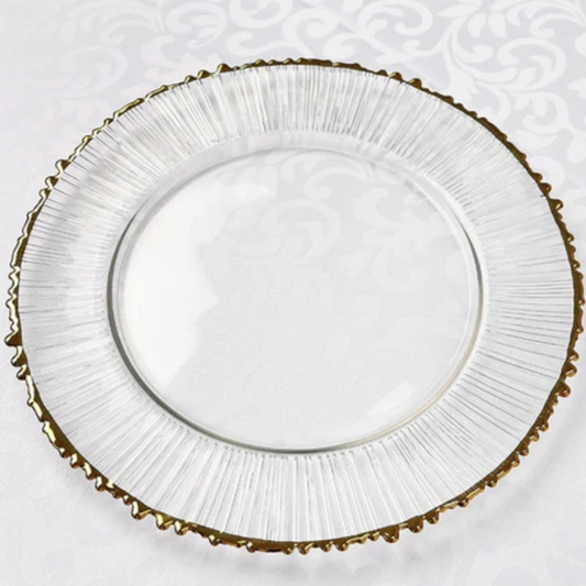 Regular price $3.50 CADRegular priceUnit price / perSale price $3.50 CADEnhance your table settings with Missy - Glass Charger Plate. Its sophisticated design and ornate rim detailing are perfect for high-class events and receptions. Add a touch of elegance to your next catered affair.
