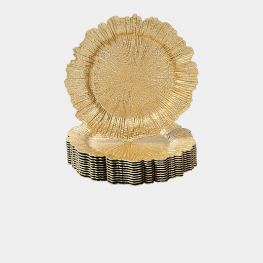 Regular price $1.00 CADRegular priceUnit price / perSale price $1.00 CADElevate your table setting with these luxurious gold reef charger plates, perfect for weddings, upscale dinners, banquets, and festive celebrations. Designed with a reef-inspired edge and a brilliant metallic finish, these plates bring sophistication and glamour to any occasion.